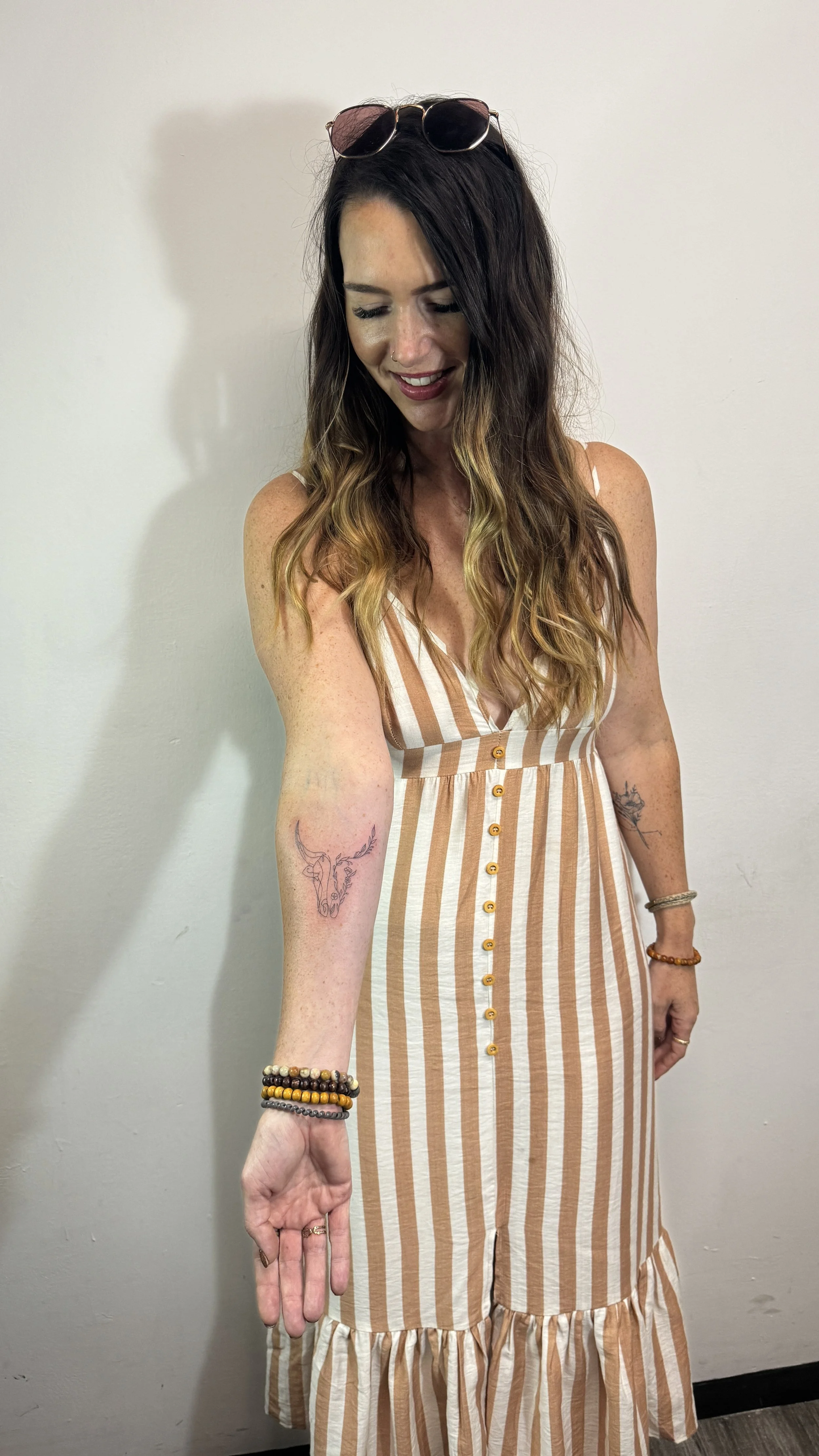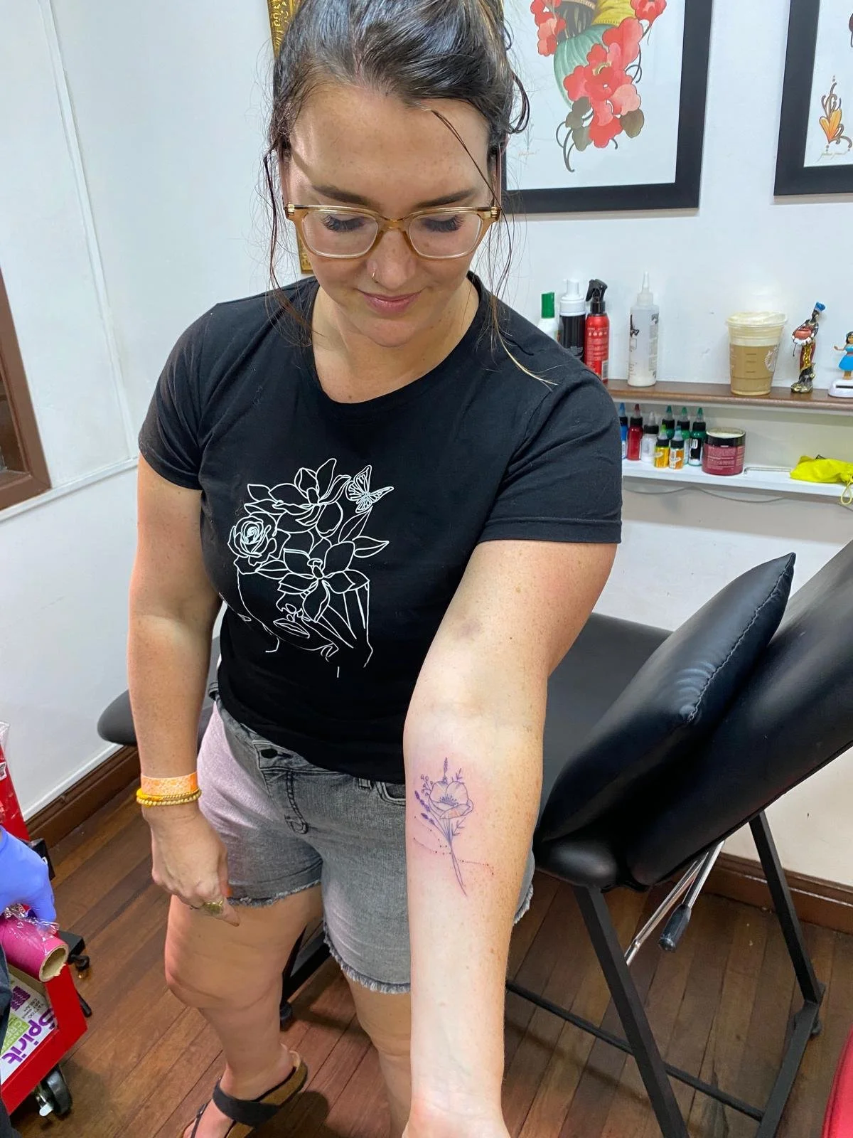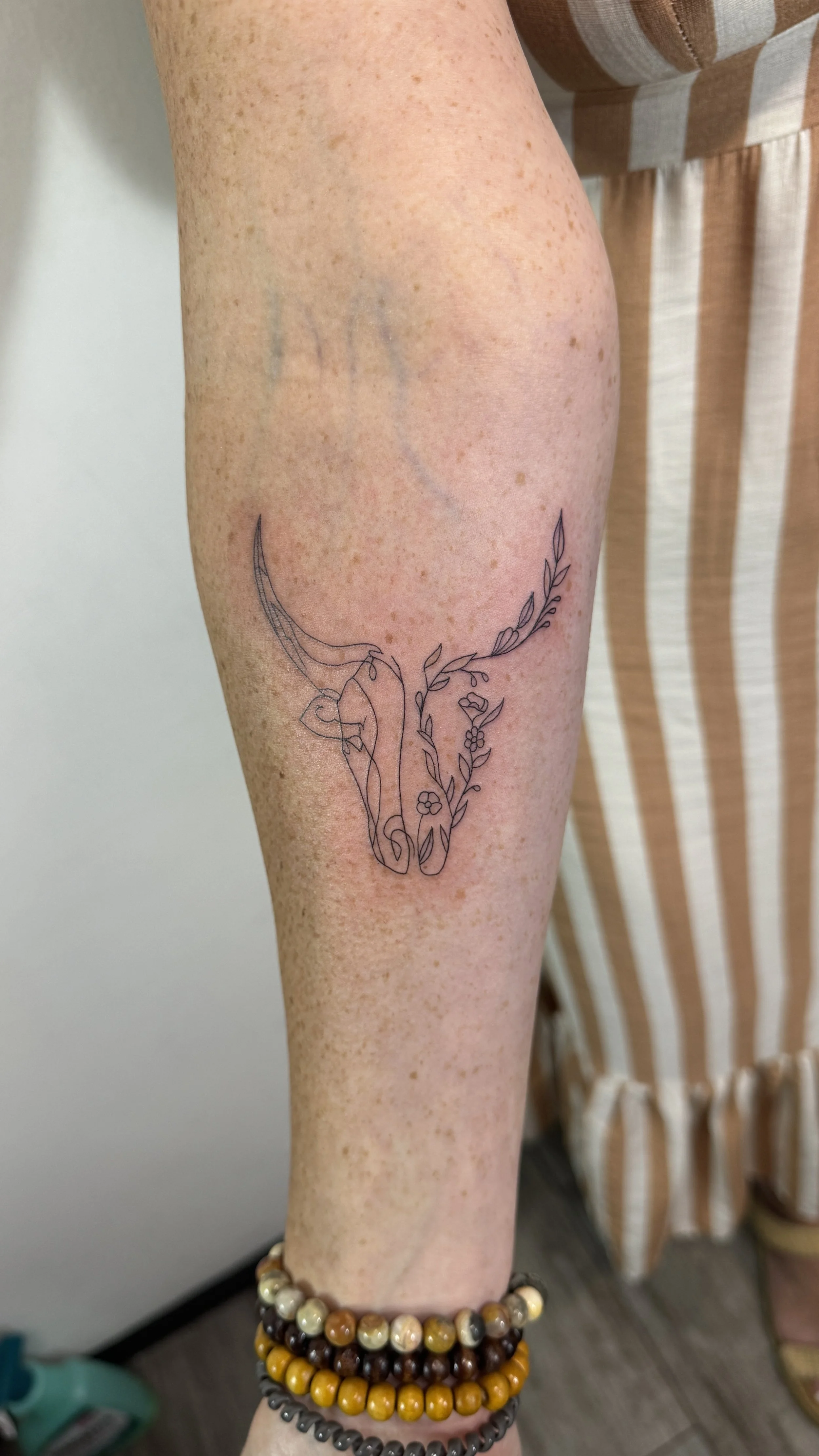 Fourth tattoo: CDMX 2024 - Bull with flowers on my right forearm. This was a tattoo I considered getting the previous time and got Frida instead. I figured if a year later I still wanted this tattoo, I was safe! I love the fine lines and the Taurus reference + the flowers.